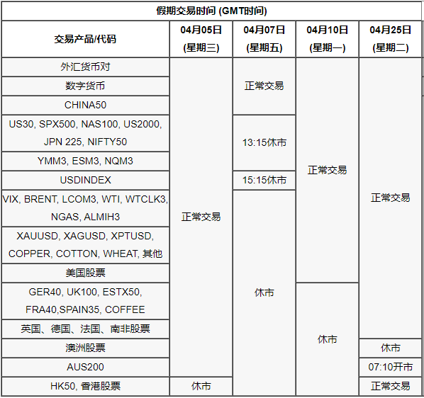您好! 2023年4月05日为清明节假期,2023年4月07日至10日为复活节假期,4月25日为澳新军团日假期。届时,相关产品的交易时间将会受到影响,详情请查看下表: